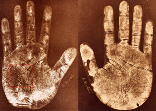 爱因斯坦的语言发育迟缓,是现在不争的事实,在这张手图上可以看到双手的2线尾部都有三叉现象,这种分叉仅仅表示儿童时期语言表达能力差,成年后则提示神经衰弱。这张手图是爱因斯坦成年后提供的,所以这种分叉表示他在这个时期出现严重的脑神经衰弱。